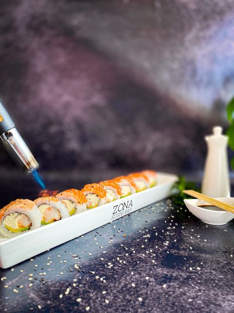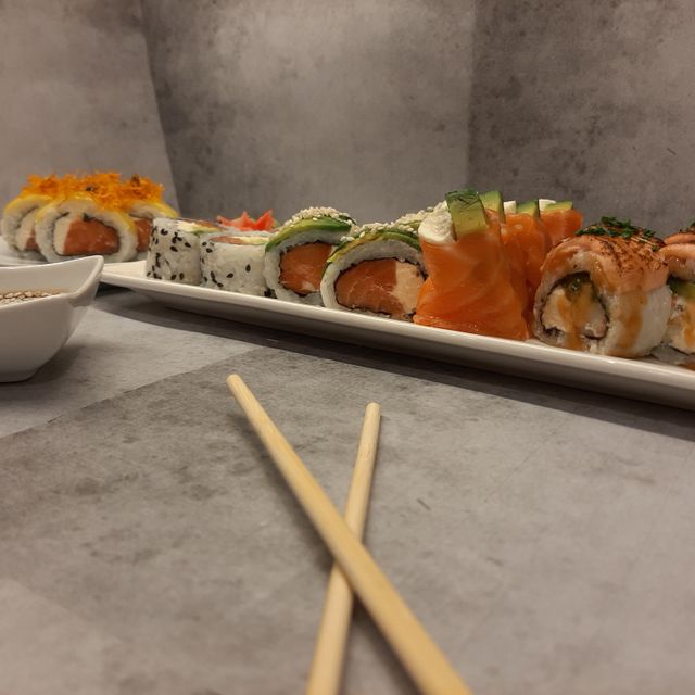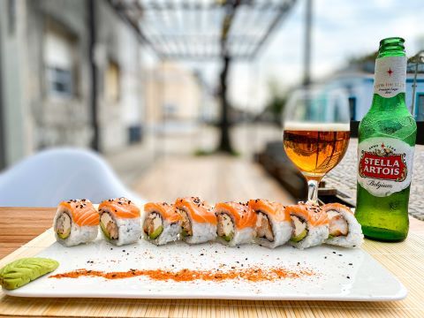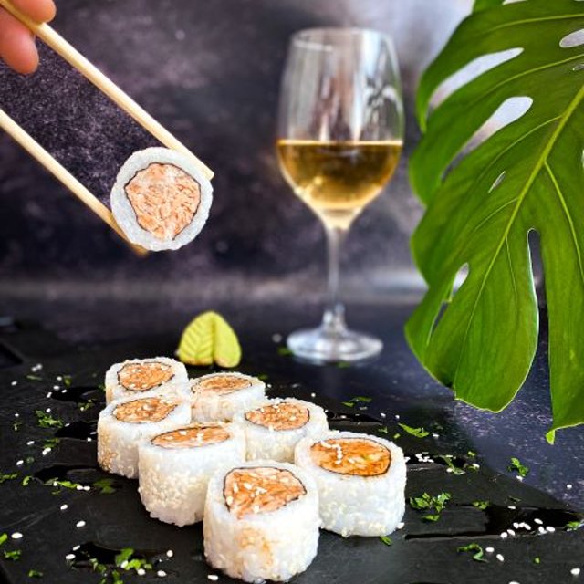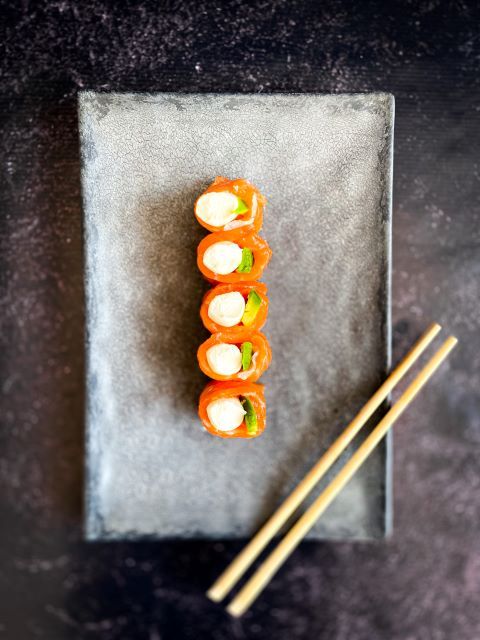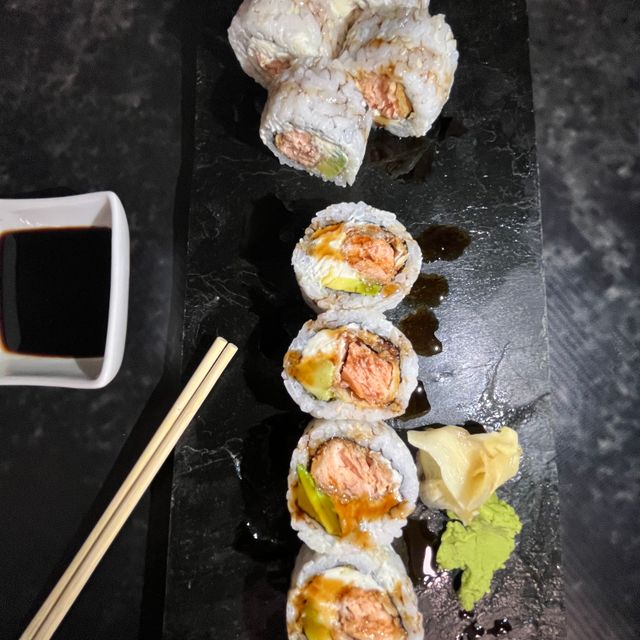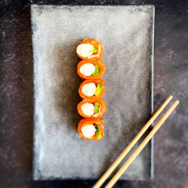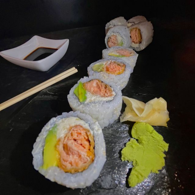 Relleno de langostinos picantes, palta y queso cubierto con finas laminas de salmón y salsa agridulce