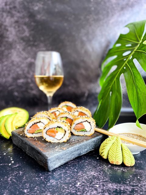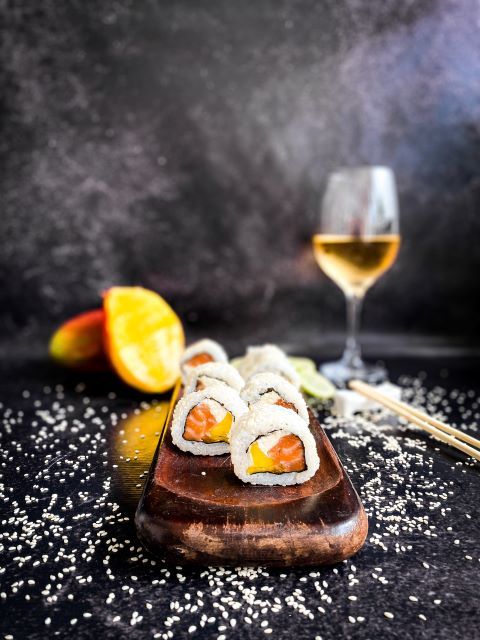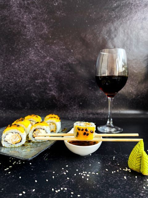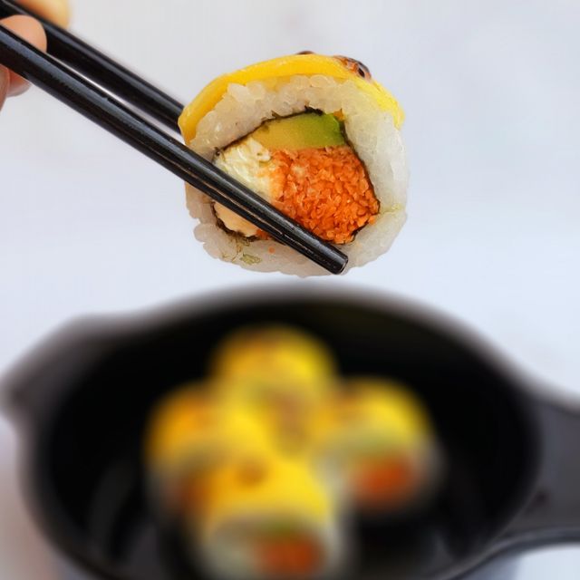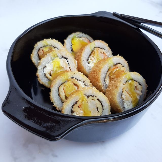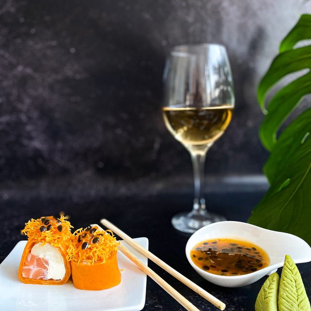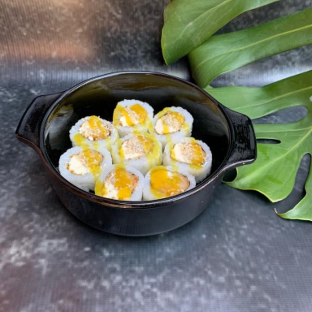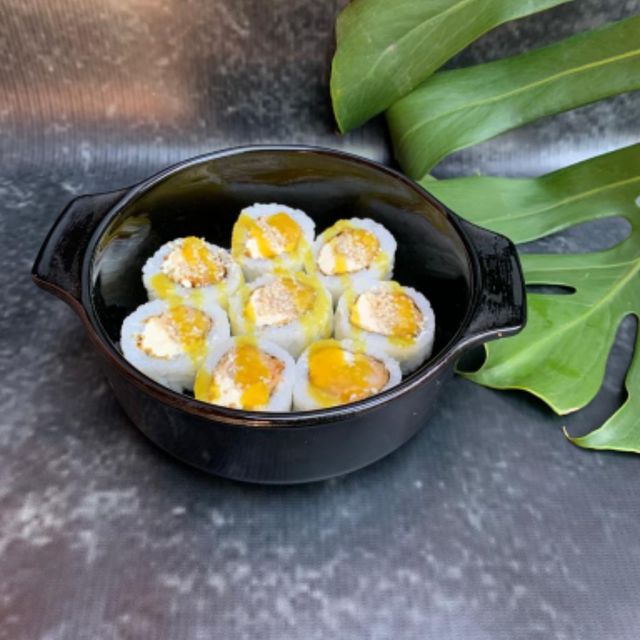 Roll relleno de lenguado con panko, rucula y queso. Cobertura de mango, verdeo y Maracuya