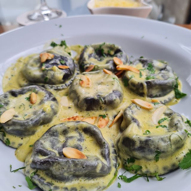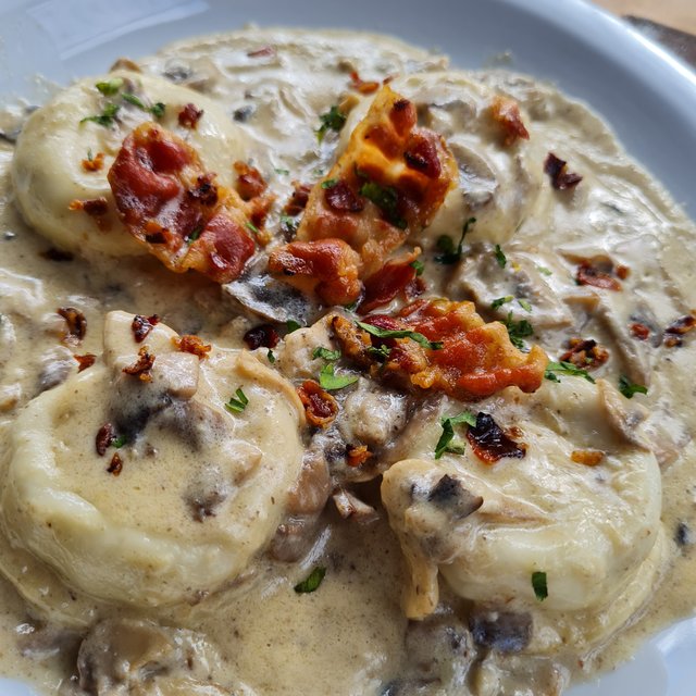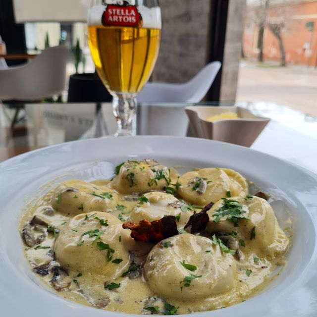 Sorrentinos rellenos de osobuco, con salsa de hongos