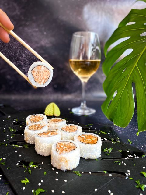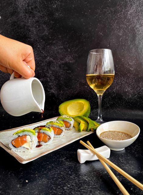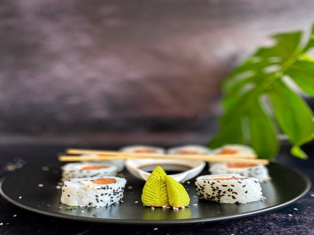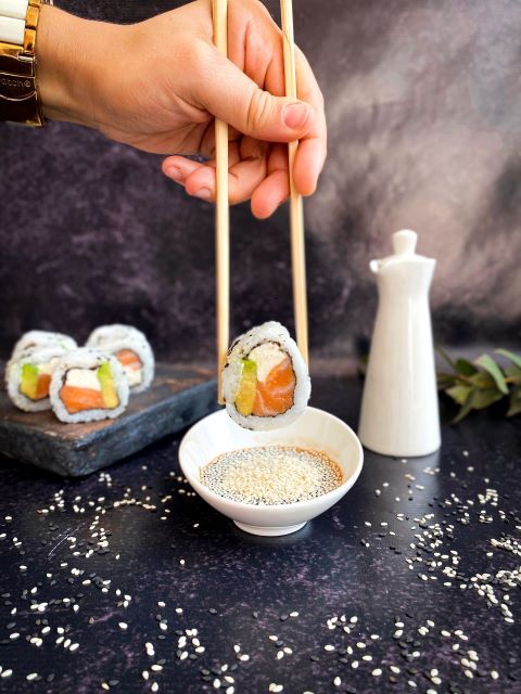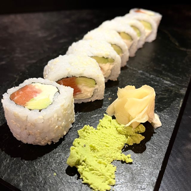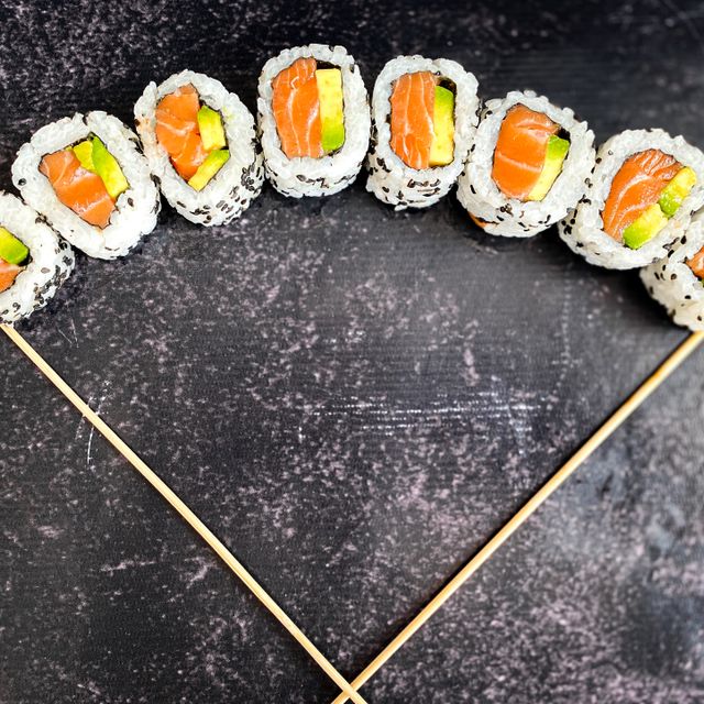 Roll relleno de salmón, palta y queso con semillas de sesamo