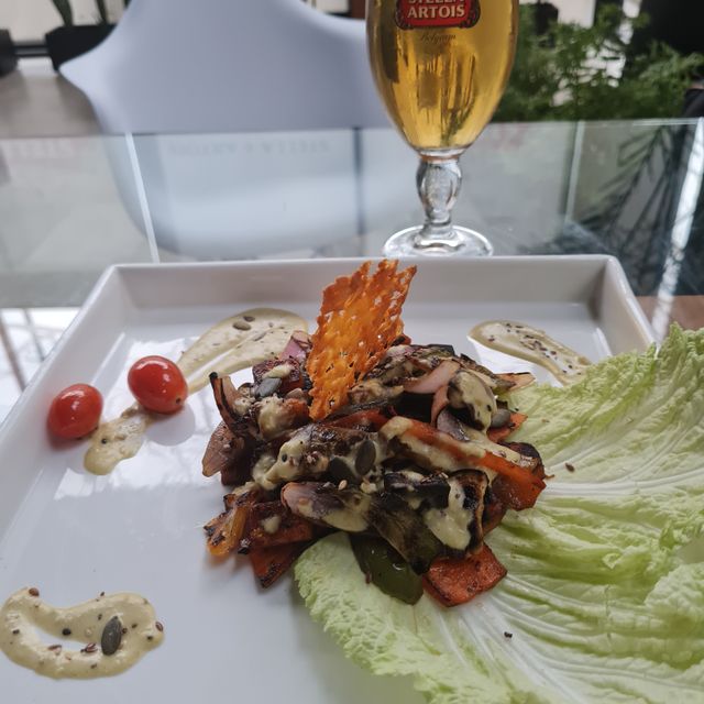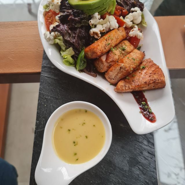 Mix ee hojas verdes, cherrys, palta, pochoclos, salmon grillado, vinagreta de narnaja y miel