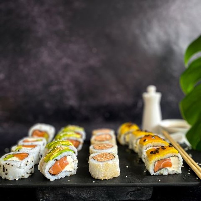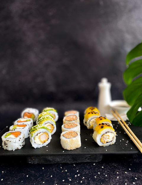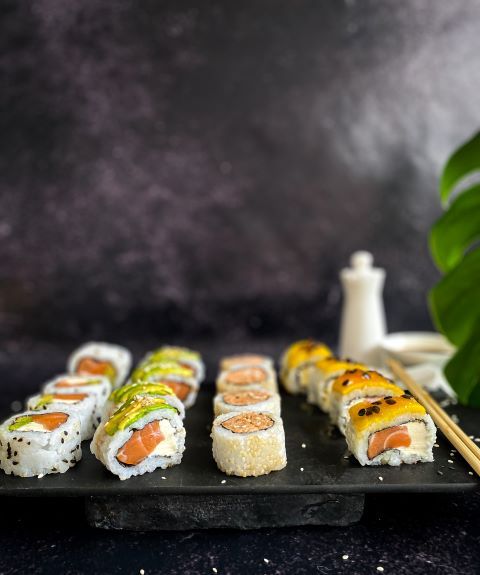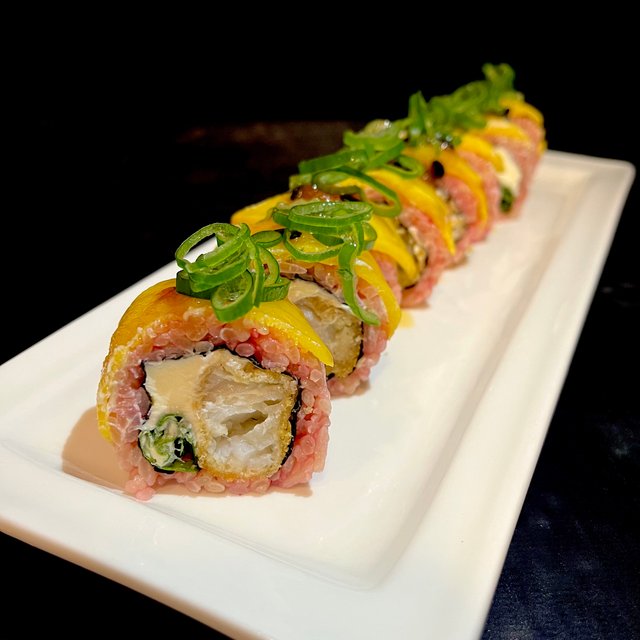Relleno de salmón y queso phila, cubierto de mango y salsa de maracuya