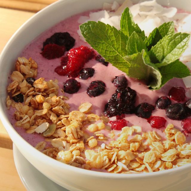 Batido de frutos rojos, con granola, coco en escama, frutos secos y frutas.