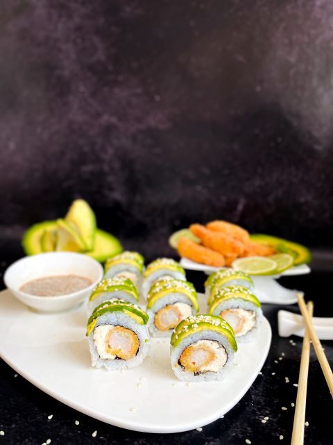 Relleno de langostinos furai y queso phila cubierto de laminas de palta y salsa agridulce