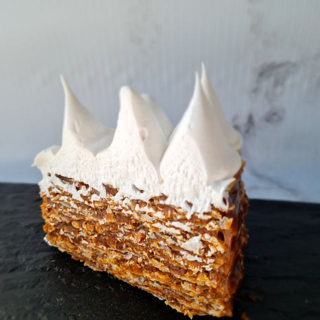 Relleno de zanahoria rallada, palta y queso, cubierto con mango y salsa de maracuya