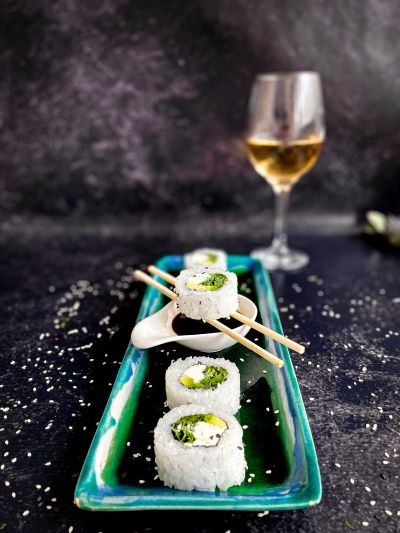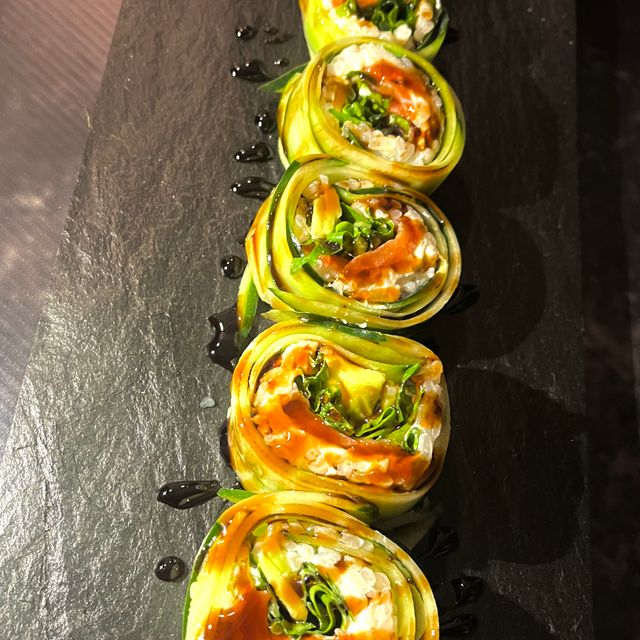 Roll de pepino, trucha, rucula y queso.