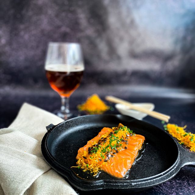10 finas lamina de salmón, cubierto de batatas fritas, salsa de maracuyá y ciboullete.