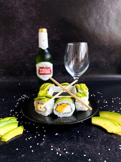 Relleno de mango y queso phila cubierto de laminas de palta y salsa agridulce