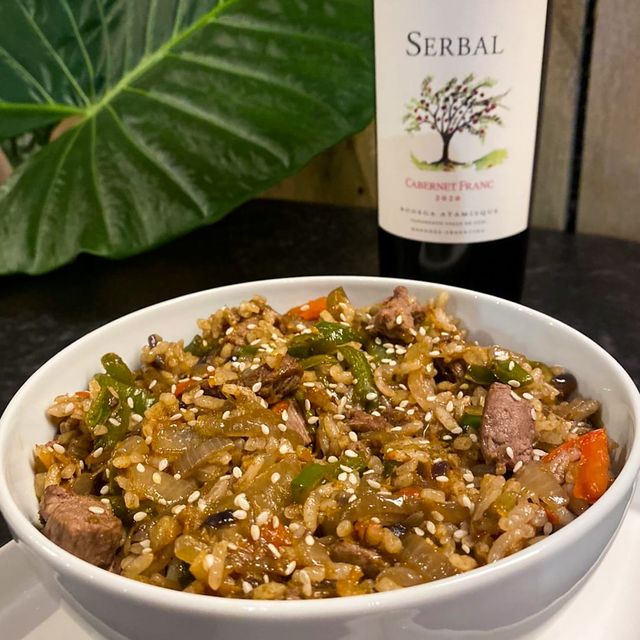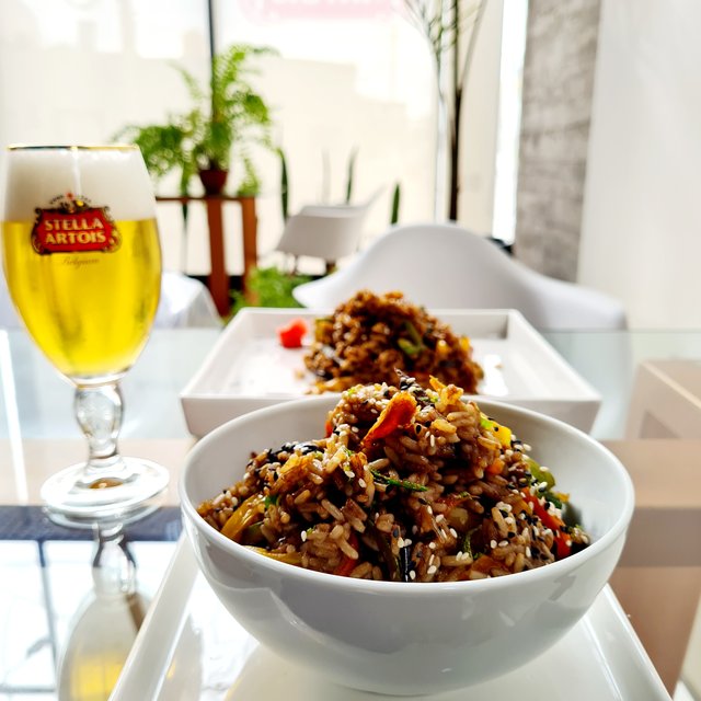 Salteado de arroz con berenjena, pimiemtos, zucchini, zanahoria y salsa de soja.