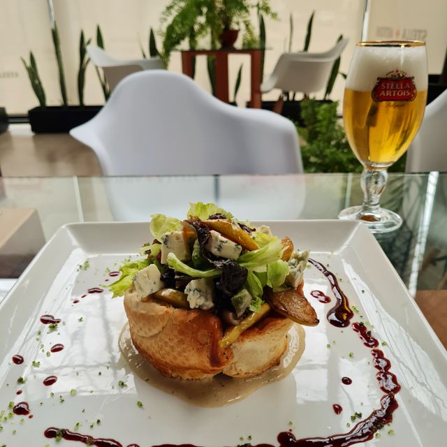 Mix de hojas verdes, queso azul, peras caramelizadas, nuecez en canasto de pan y vinagreta de mostaza, miel y