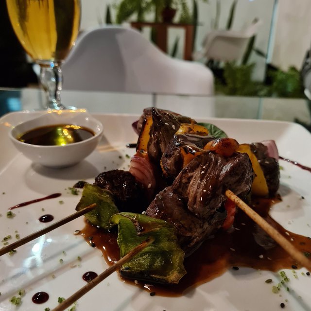 Cubos de lomo con pimiemtos, y mix de verduras salteados con papas fritas rusticas.